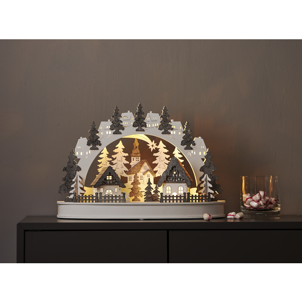 Detaljrik laserskuren ljusstake i trä, basen har ett vackert utskuret landskap med små hus och ovan på basen böjer sig en båge med granar för att rama in den lilla detaljrika byn. Dekorera till advent och jul, placera ljusstaken i ett fönster eller på en byrå för att få den perfekta julkänslan.