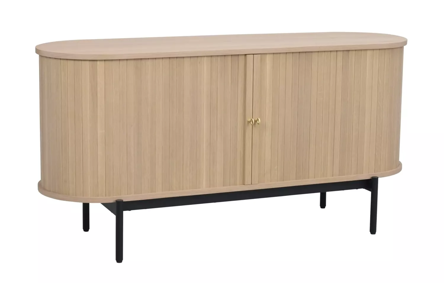 Haddington sideboard är med sin ovala form, praktiska jalusidörrar och mässingfärgade knoppar en stilren och trendig förvaringsmöbel. Bakom skjutdörrarna med ribbat mönster av massiv ek finns gott om förvaringsutrymme.