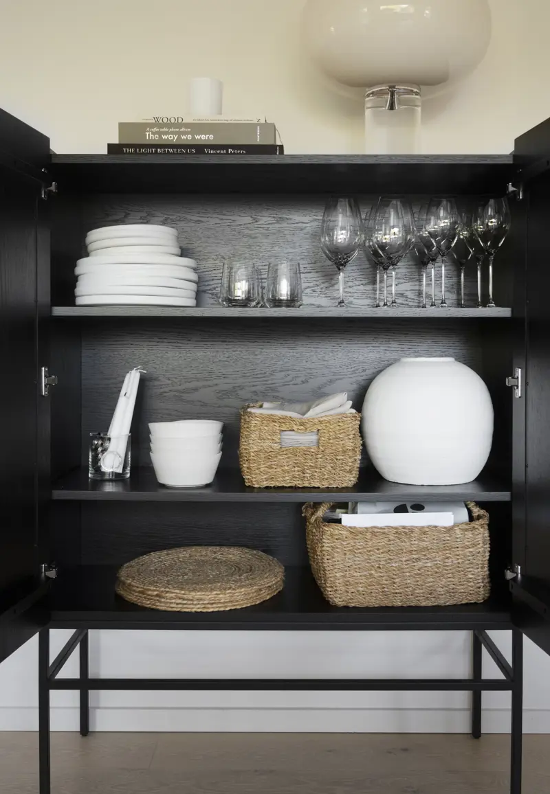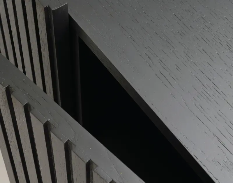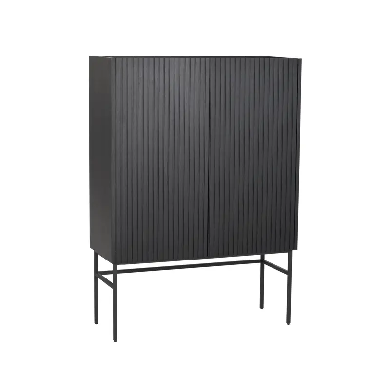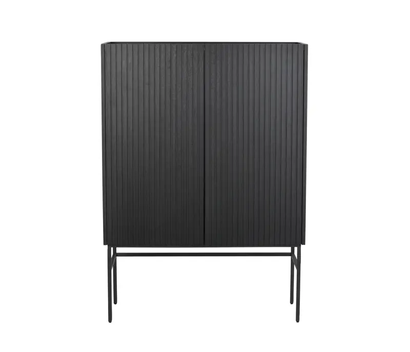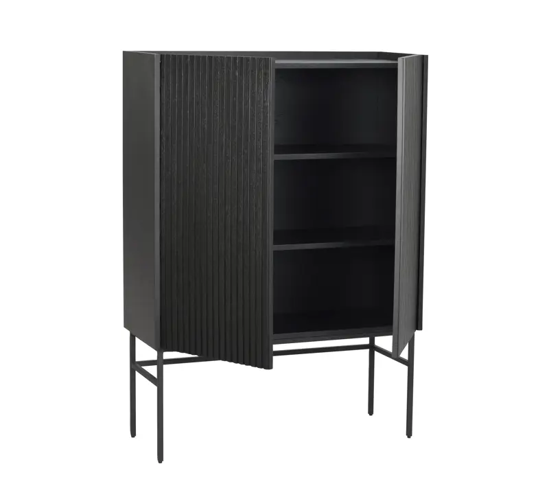 Trendiga Halifax skåp i svartlackad ek med svarta metallben i rak elegant profil. Ytan består av massiva ekribbor på faner och har två praktiska hyllplan, varav ett är justerbart. Knoppar i guldfärgad borstad metall medföljer och du väljer själv om du vill sätta dit dem eller ha utan. Dörrarna har mjukstängande soft-close funktion.