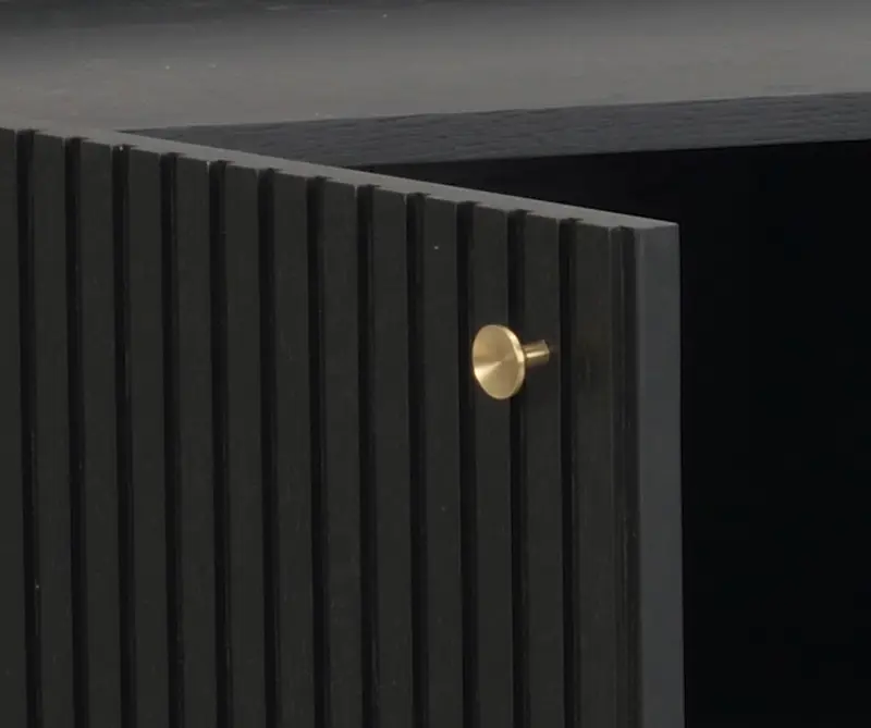 Material: Ekfanér på MDF, svart lack. Metallben i pulverlack, knopp i gulfärgad borstad metall.
