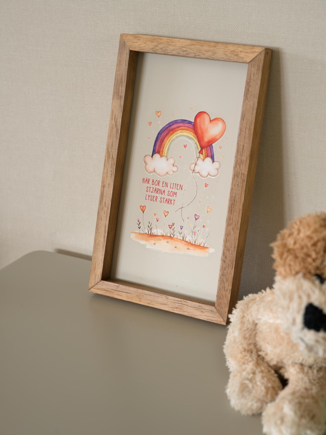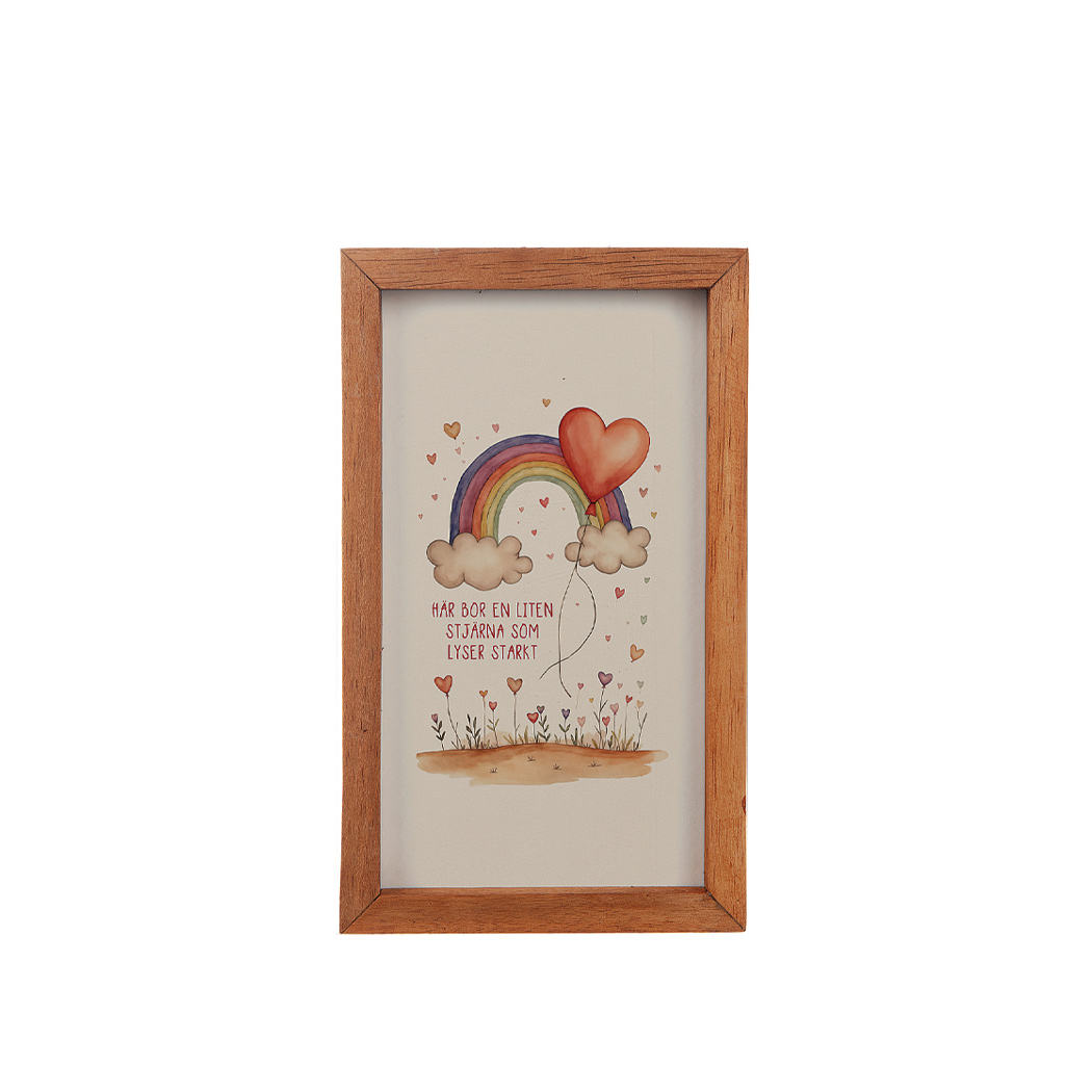 "Här bor en liten stjärna som lyser starkt" Tavlan har även en blomsteräng, en regnbåge och ett sött hjärta som motiv. En fin dekoration till barnrummet.