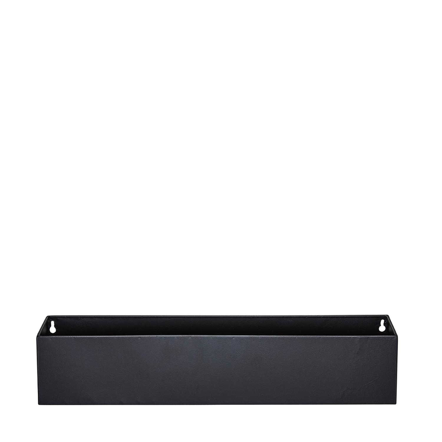 En modern vägghylla i svartmålat järn. Den har en minimalistisk och tidlös rektangulär form med rena linjer. På baksidan finns två nyckelhålsfästen för stabil väggmontering , vilket gör att den ser ut att sväva på väggen. Praktisk i hallen för nycklar och post, i badrummet för doftljus och flaskor, eller som en smidig sänghylla. Eller plantera kryddor i mindre krukor å ställ dem i hyllan.