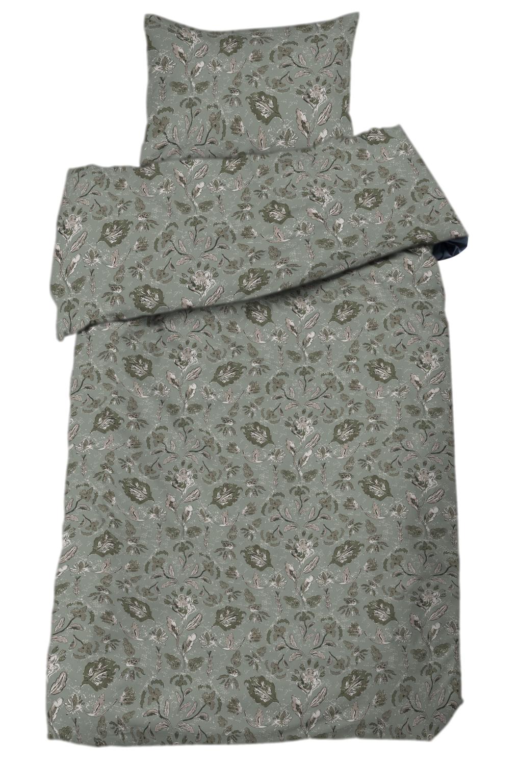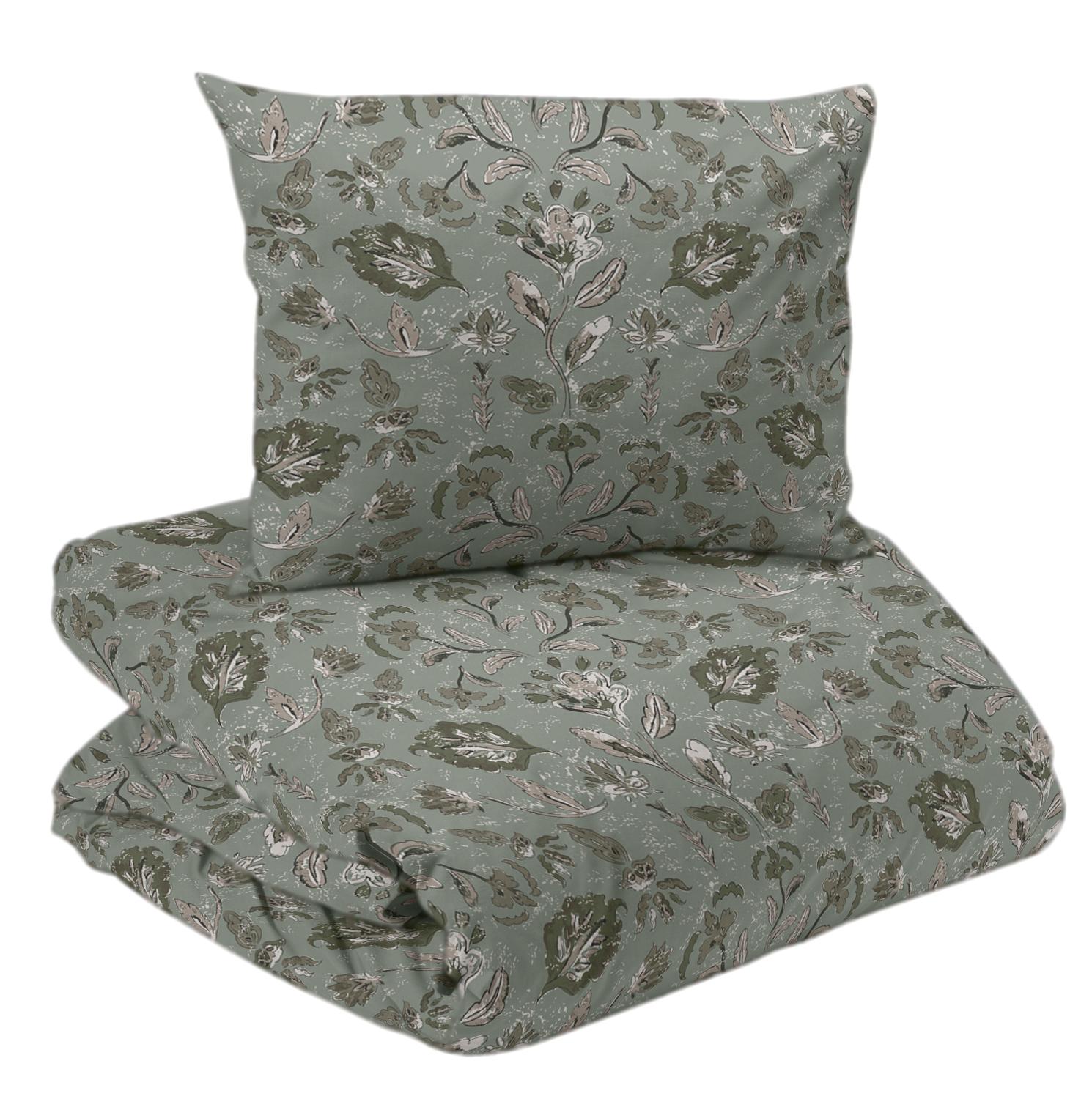 Ingela 2-dels bäddset i härlig bomullsatin med grön bottenfärg och en dovt bladmönster i grönt och beige.