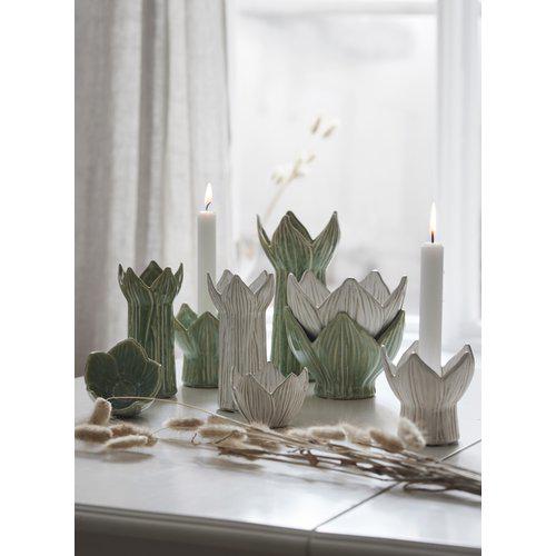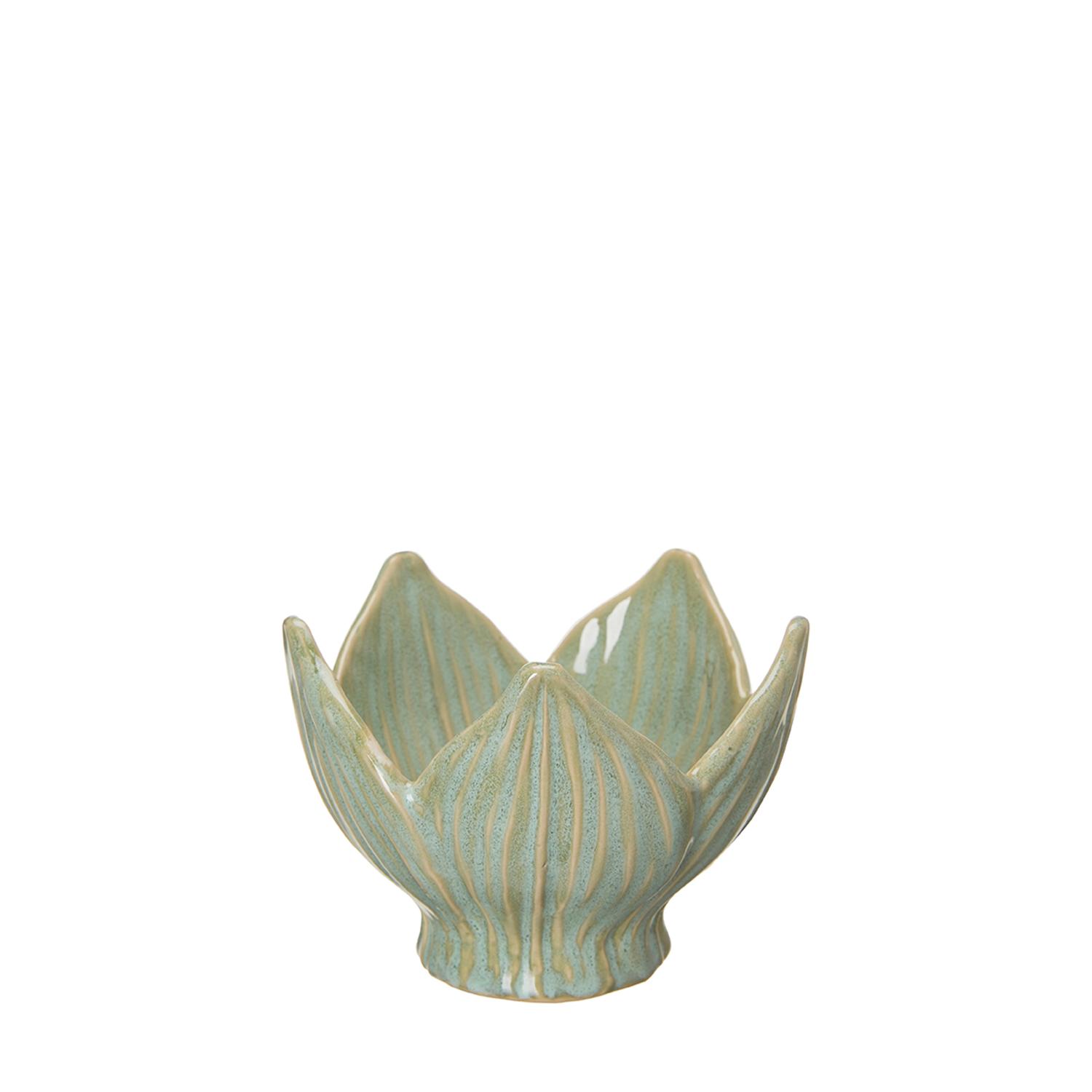 Vacker grönmålad skål som har en organisk, blomliknande form som påminner om en utslagen kronärtskocka eller en näckros. De spetsiga "kronbladen" och den markerade foten ger den ett karaktäristiskt och naturnära utseende. Denna produkt är unik så ingen är den andra lik.