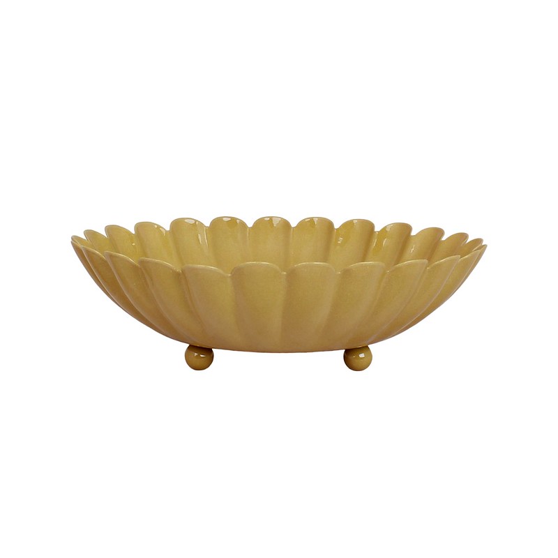 Snygg gul skål i plåt med dekorativ kant som står på tre runda fötter. Skålen är handgjord i Indien och dess vågformade kanter är handklippta. Små variationer i färg och form kan förekomma.