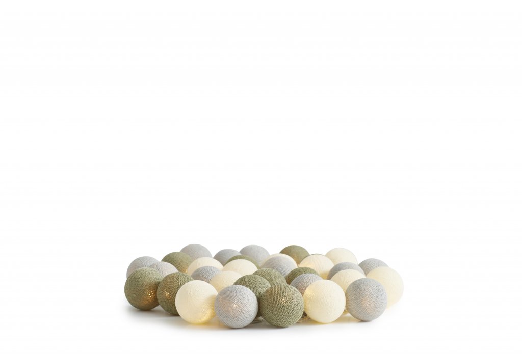 Vacker LED-ljusslinga från Iris Lights med runda bollar som är tillverkade i Thailand. Varje boll är handgjord av tunn färgad tråd och ett naturvänligt lim. De färgade bollarna ger ett otroligt fint och mysigt sken.