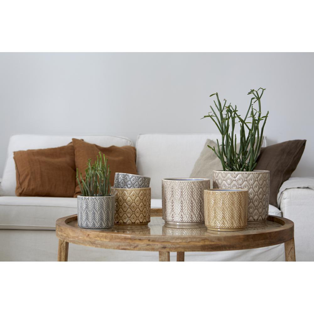 Vacker kruka i fint stansat bladmönster stengods i en snygg ljusgrå färg. Matcha gärna med den mindre krukan i likadant utförande.