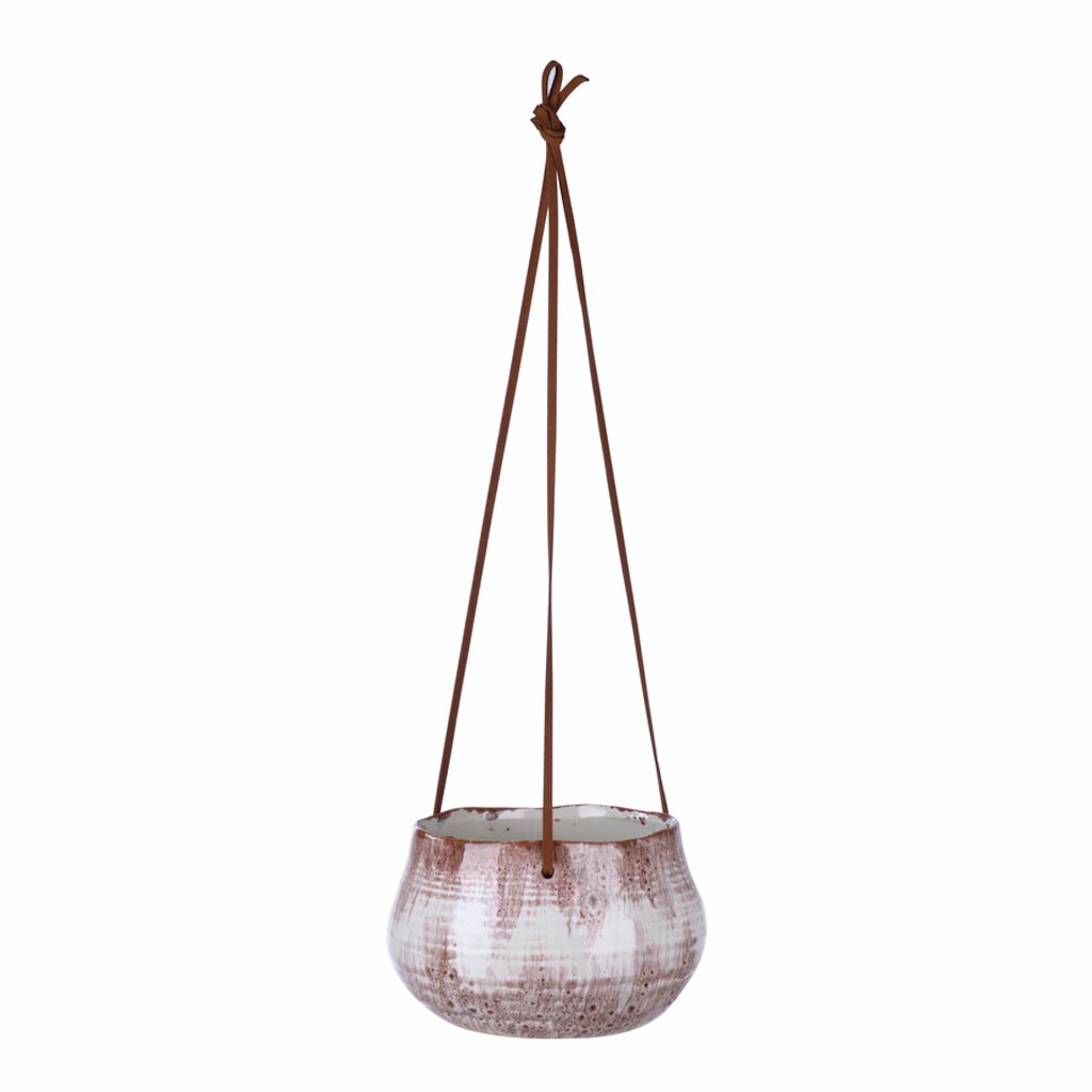 Denna ampel består av en rundad keramikkruka med ett effektfullt, melerat mönster i rosa med lite vita inslag. Krukan hänger i tre bruna läderremmar som samlas i en knut upptill för upphängning. Vacker kruka för din hängande blomma.