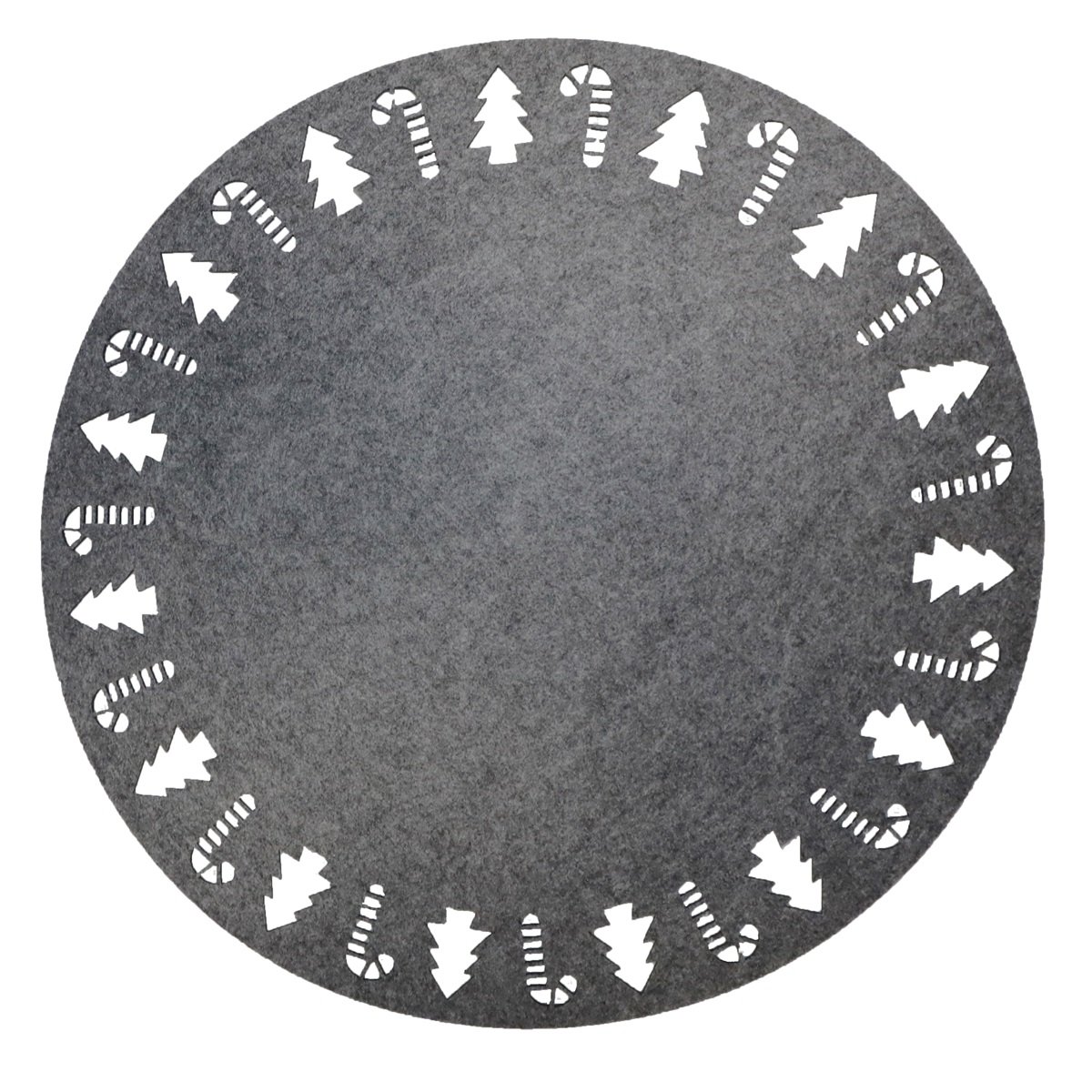 Rund filttablett med mönster av granar och polkagrisar runt om.