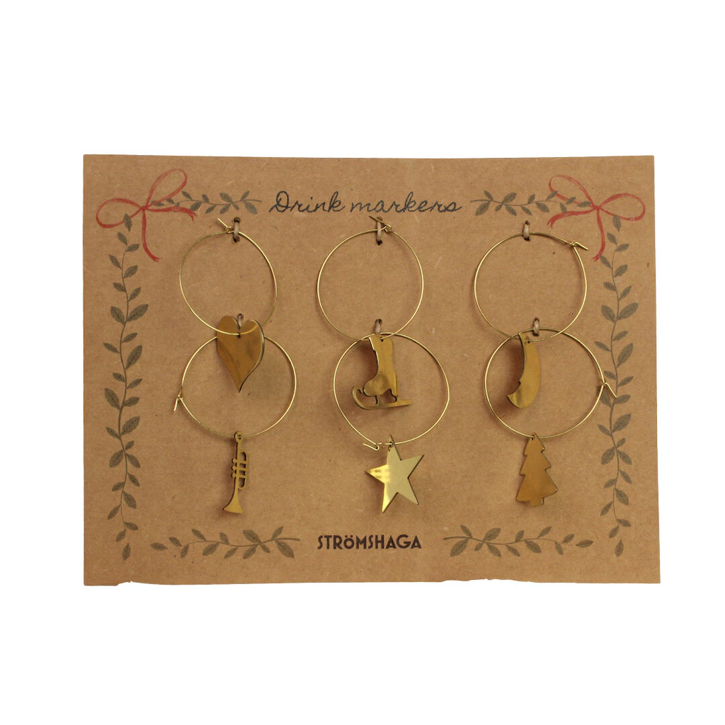 Praktiska och snygga glasmarkörer i form av små runda öglor i mässing, dekorerade med små julsymboler i mässing. De fästs enkelt runt glasets fot för att hjälpa dig och dina gäster att hålla koll på vilket glas som är vems. Också fin som gå bort-present.