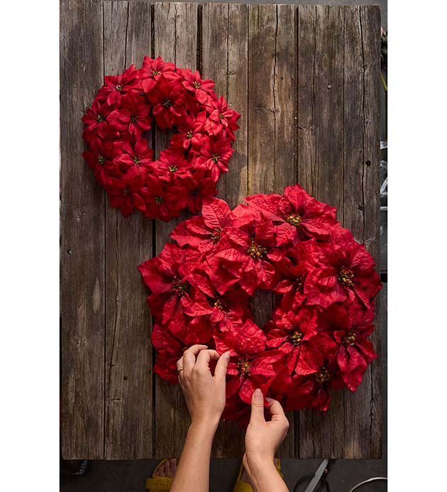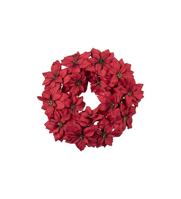 Vacker och naturtrogen krans med röda julstjärnor. Här har du den perfekta kransen att hänga på dörren som kommer vara lika fin år efter år.