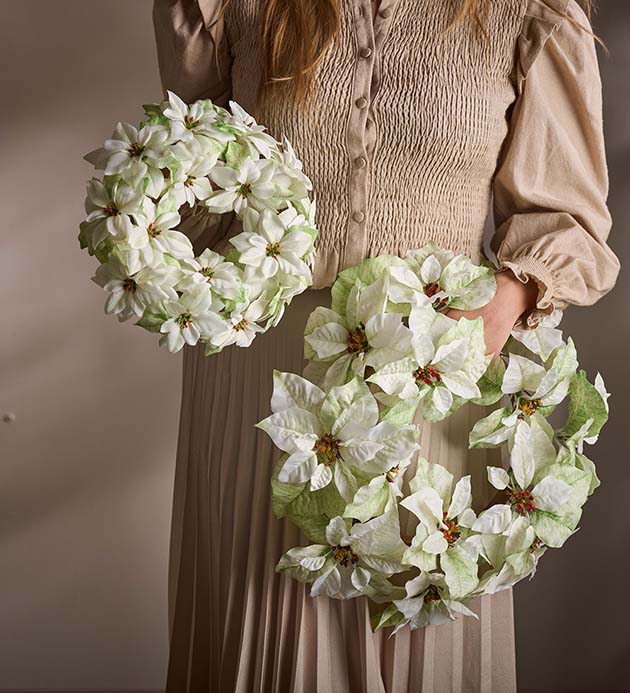 Vacker och naturtrogen krans med vita julstjärnor. Här har du den perfekta kransen att hänga på dörren som kommer vara lika fin år efter år.