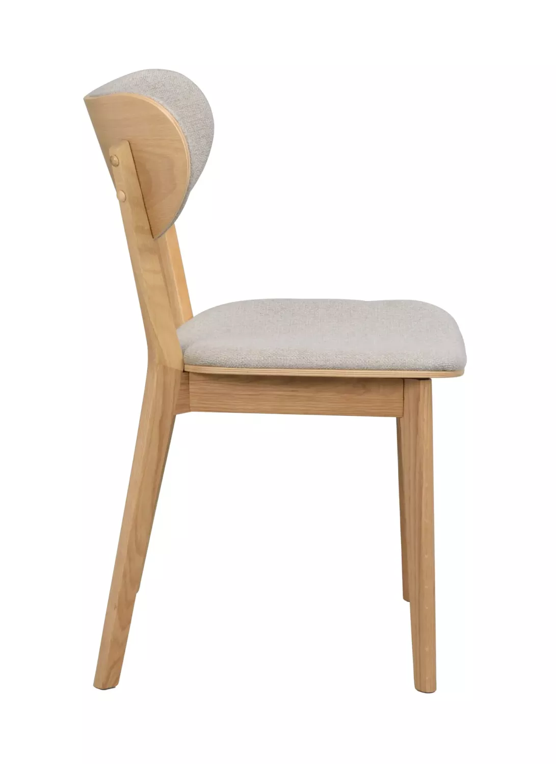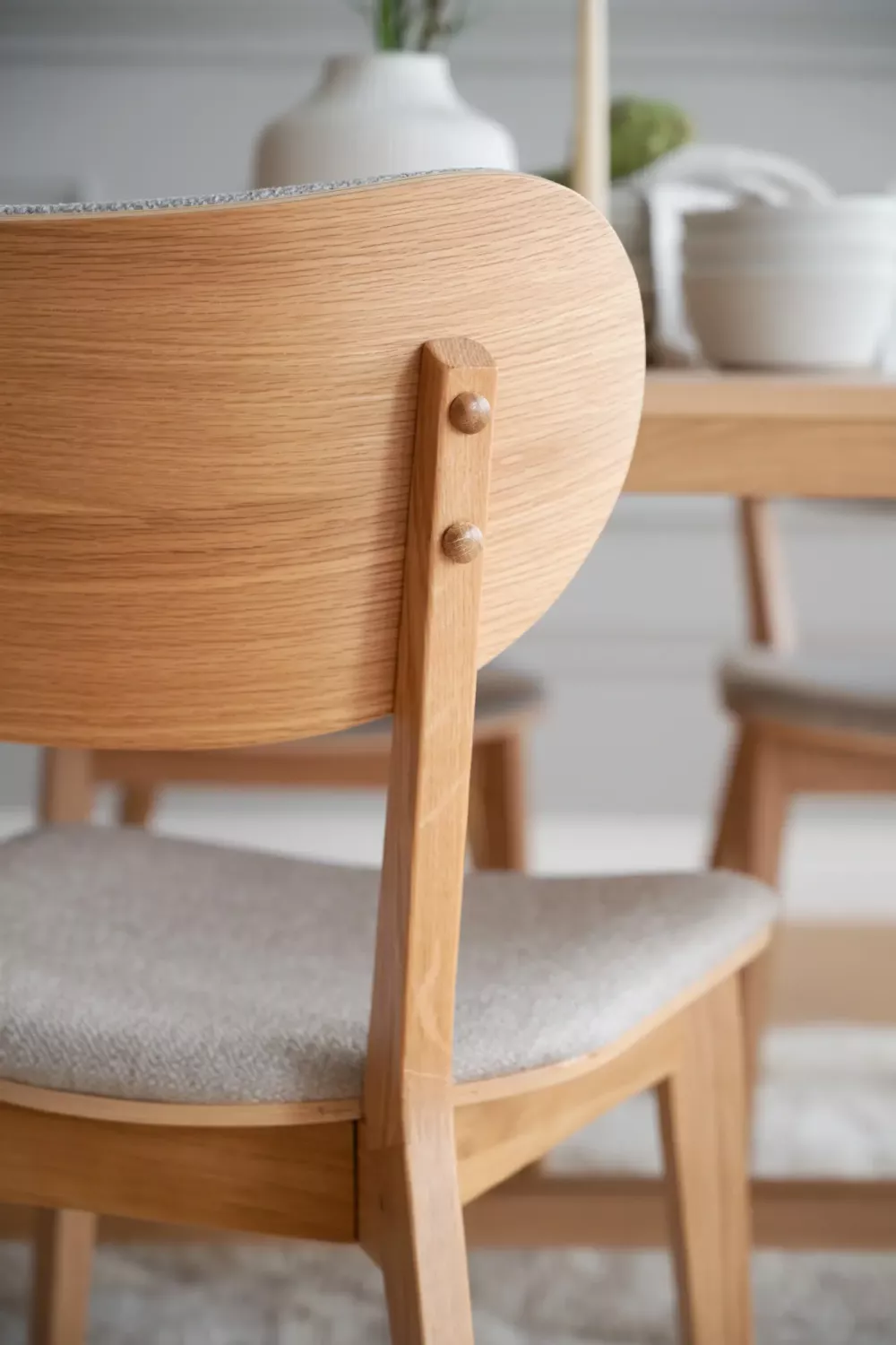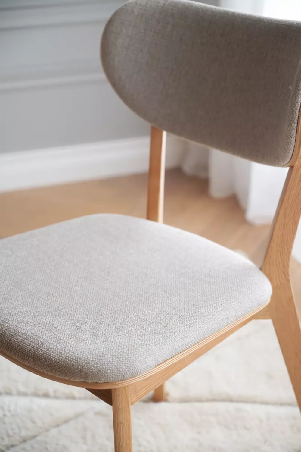 Stolen Kato i massiv lackad och FSC®-certifierad ek andas skandinavisk design och har en stoppad sits och ryggbricka av slitstark gråbeige textil.