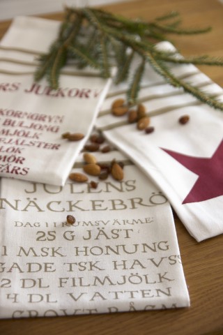Kökshandduk i vitt med recept på Ingers julkorv.