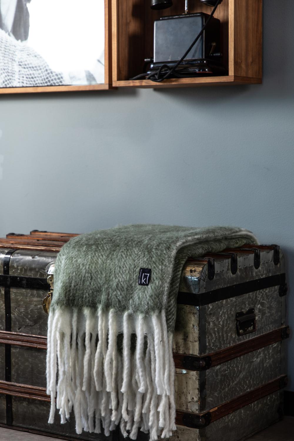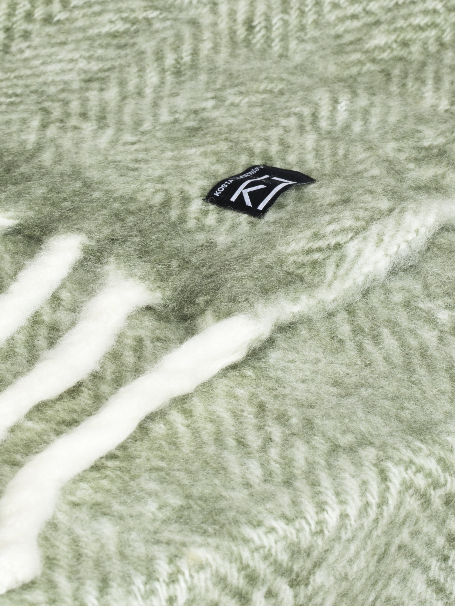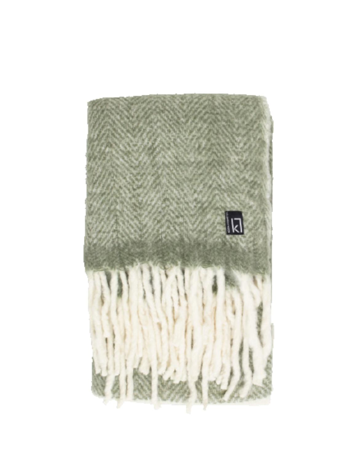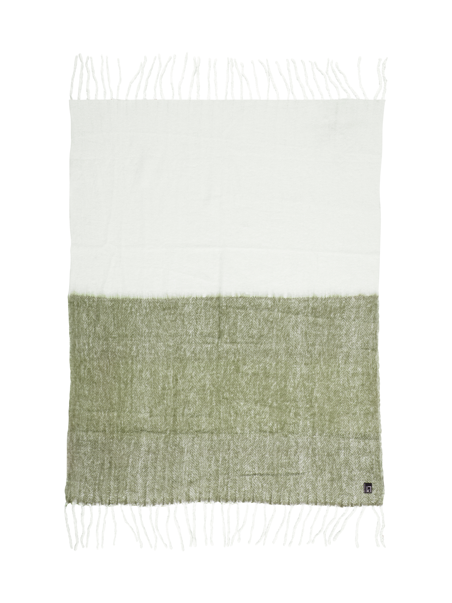 Mjuk och mysig pläd att vika efter behag. Längst ut burriga långa fransar. Passar lika bra som inredningsdetalj, gåva eller svepa om sig en kylig kväll. Kommer här i en fin offwhite och grön färg.