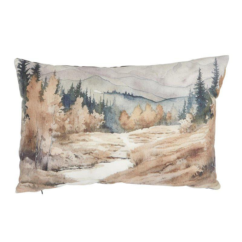 Kuddfodral med ett vackert landskapsmotiv i höstfärger som framkallar fridfulla naturupplevelser och nordiskt lugn. Baksidan är enfärgad svart, vilket skapar en fin kontrast och ger kuddfodralet ett elegant och mångsidigt utseende.