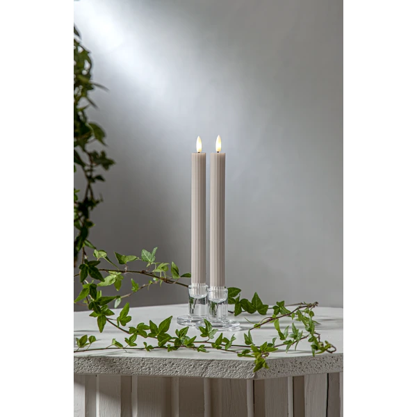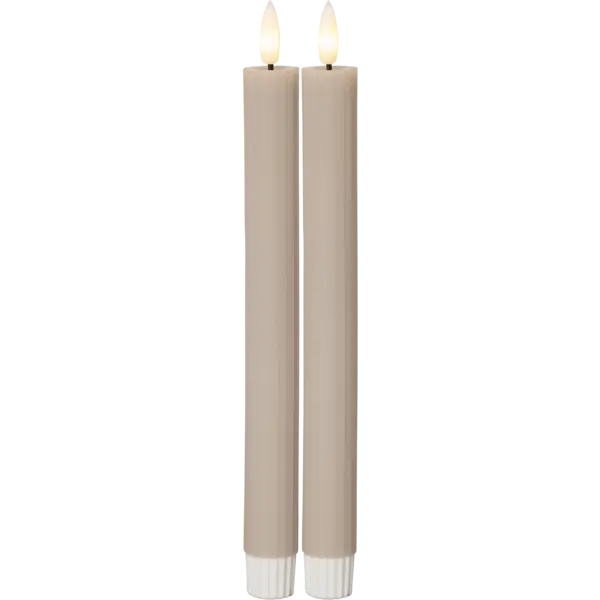 2 pack beige antikljus i vår Flamme Stripe serie, gjorda i vax i med en räfflad-randig yta. Ljusen har en mycket naturtrogen låga som lyser med varmvitt sken. De har timerfunktion vilket gör att ljusen lyser i 6h per dag i ca 30 dagar. De drivs av 2 AAA batteri för varje ljus, dessa ingår ej. Dessa ljus har en silikonbelagd fot som gör att ljusen står stadigare i ljushållaren. Undvik att ställa ljusen i direkt solljus då de kan smälta och missfärgas av värmen.
