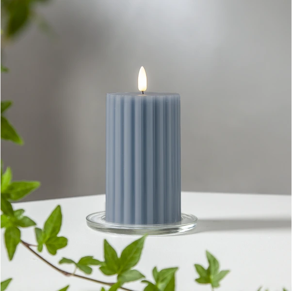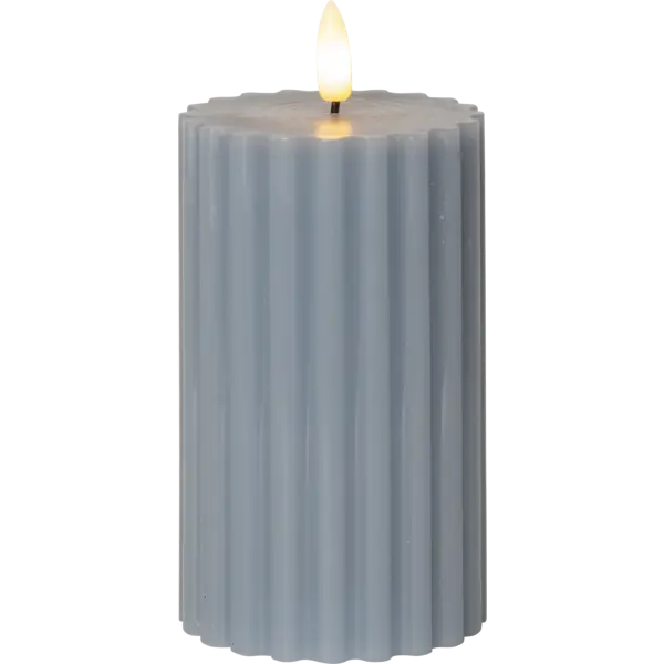Flamme Stripe är ett blockljus gjord av blå vax med en räfflad-randig yta. Ljuset är cirka 8x15cm inklusive lågan. Detta batteriljus blir en vacker dekoration, både ensam och i grupp ihop med övriga ljus från vår Flamme serie. Det har timerfunktion och när brytaren är på timerläget lyser ljuset i ca 30 dagar med en vacker realistisk låga i varmvitt. Det drivs av 2 AA batterier, dessa ingår ej. Undvik att ställa ljusen i direkt solljus då de kan smälta och missfärgas av värmen.