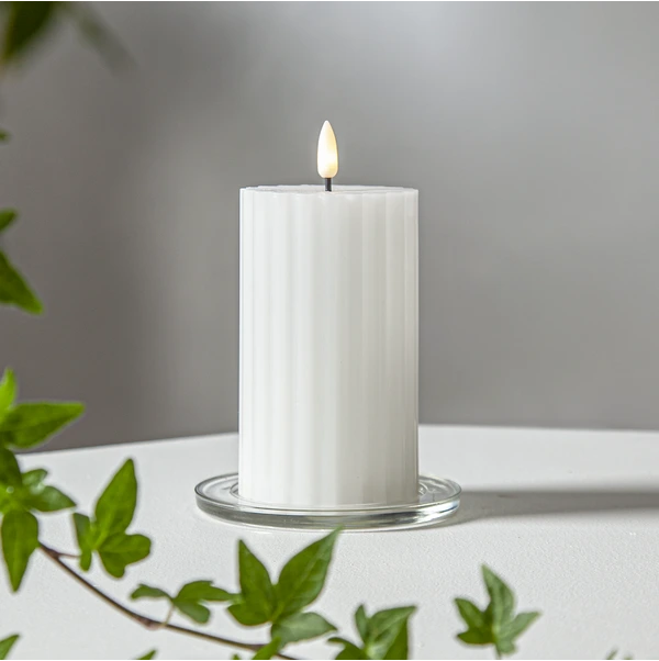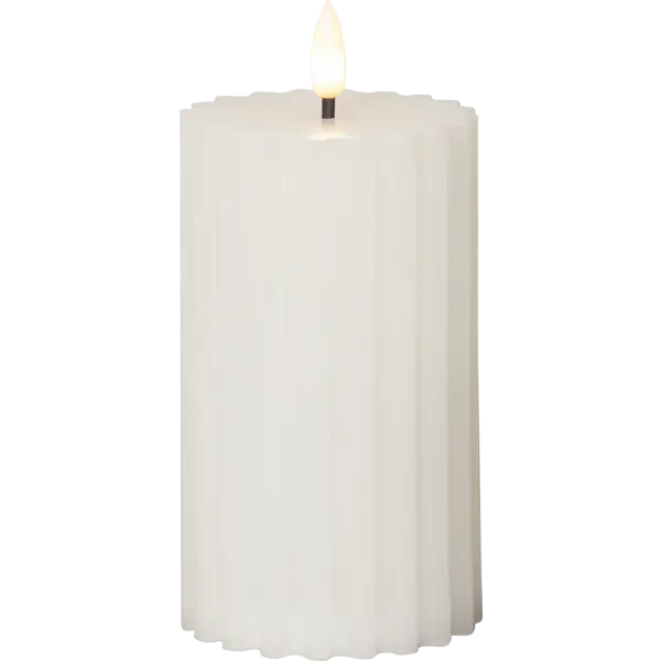 Flamme Stripe är ett blockljus gjord av vit vax med en räfflad-randig yta. Ljuset är cirka 8x15cm inklusive lågan. Detta batteriljus blir en vacker dekoration, både ensam och i grupp ihop med övriga ljus från vår Flamme serie. Det har timerfunktion och när brytaren är på timerläget lyser ljuset i ca 30 dagar med en vacker realistisk låga i varmvitt. Det drivs av 2 AA batterier, dessa ingår ej. Undvik att ställa ljusen i direkt solljus då de kan smälta och missfärgas av värmen.
