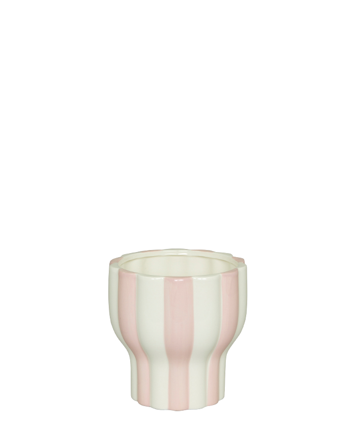 Frän kruka som är smalare nertill och bredare upptill som med rosa och vita lodräta ränder ger ditt hem en känsla av vår. Plantera din favoritblomma och låt helheten pryda ditt hem.