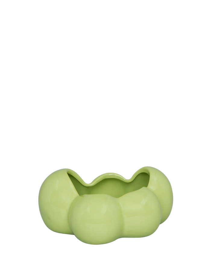 Vacker skål i ljusgrön keramik som har en böljande och organisk form som påminner om en tulpan eller ett moln. Den har en glansig finish och en karaktäristisk vågig kant som ger ett lekfullt och dekorativt uttryck. Perfekt att använda som godisskål, smyckesfat eller bara ha som dekoration på en hylla eller ett bord. Eller varför inte plantera något fint i den.