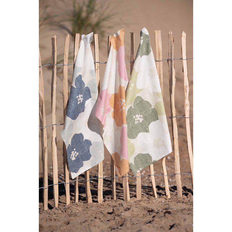 Kökshandduk i 100% bomull med ett storblommigt mönster som för tankarna till retrostilens lekfulla färger och former. Den blir en charmig detalj i köket och tillför en varm, nostalgisk känsla med en modern twist. Kommer här i färgerna orange, rosa och vitt.