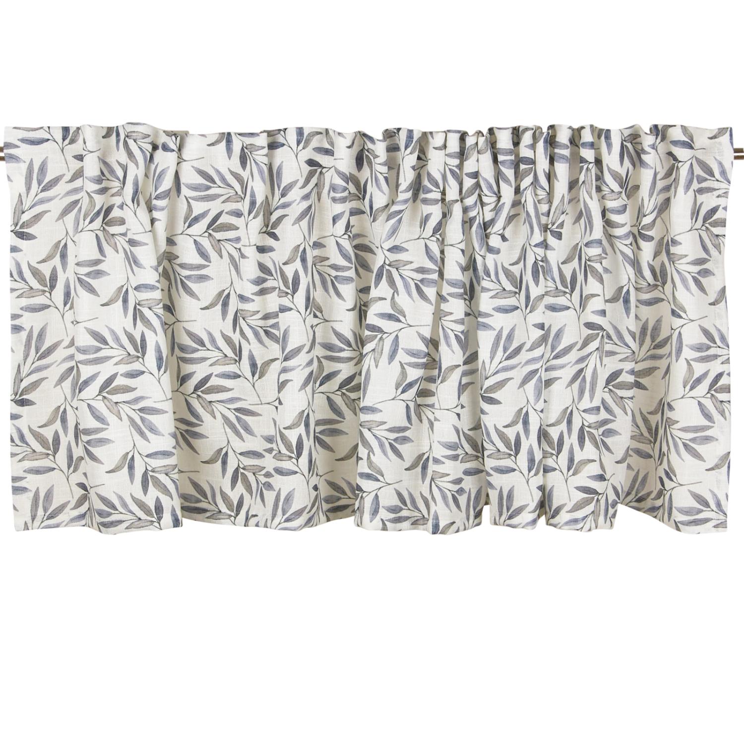 Gardinkappa tillverkad i polyester med ett fint digitaltryckt lövmönster i blått och grått på en offwhite botten.