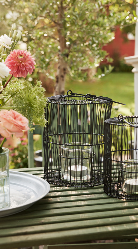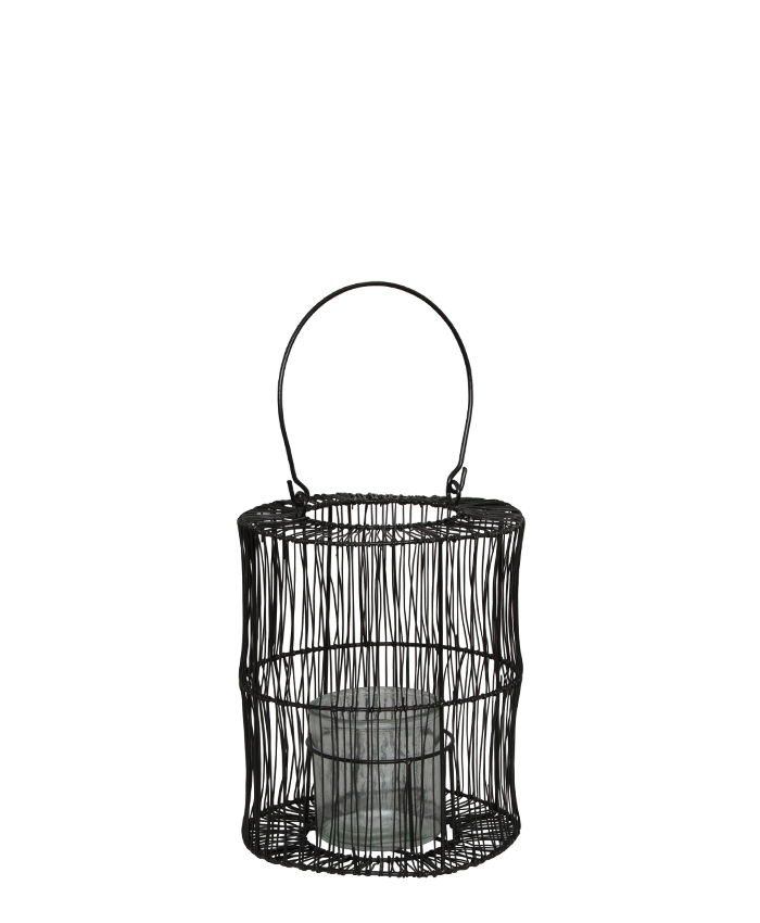 Lyktan på bilden är en trådlykta i svart metall med en rustik och minimalistisk design. Inuti lyktan finns en ljushållare i klarglas avsedd att skydda ett ljus från vind och sprida ett mjukt sken. Den har även en stor, rundad bygel som gör den enkel att bära eller hänga upp. Matcha gärna med lyktan i den mindre storleken.