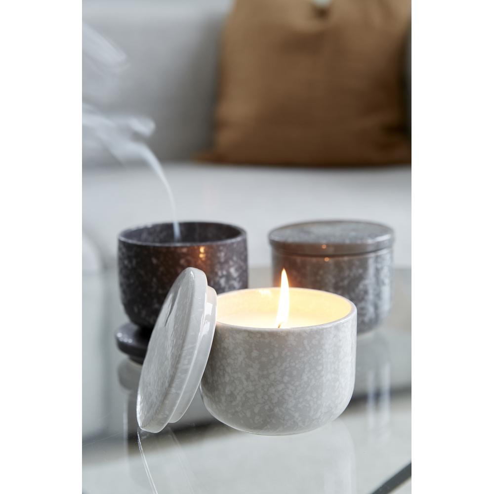 Fint ljus i grå marmorliknande porslinsskål med lock. Låt ljuset brinna ut och använd sedan skålen till smycken, nyklar eller något annat kul. Garanterat en uppskattad present.