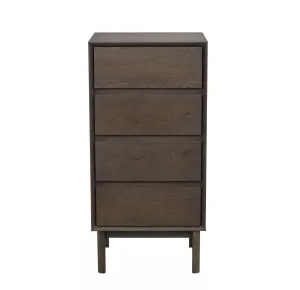 Byrån Mackay i brun vildek med 4 lådor är ett gediget hantverk med girade hörn och en inramning runt lådorna som skapar ett djup och ett härligt skuggspel på möbeln.