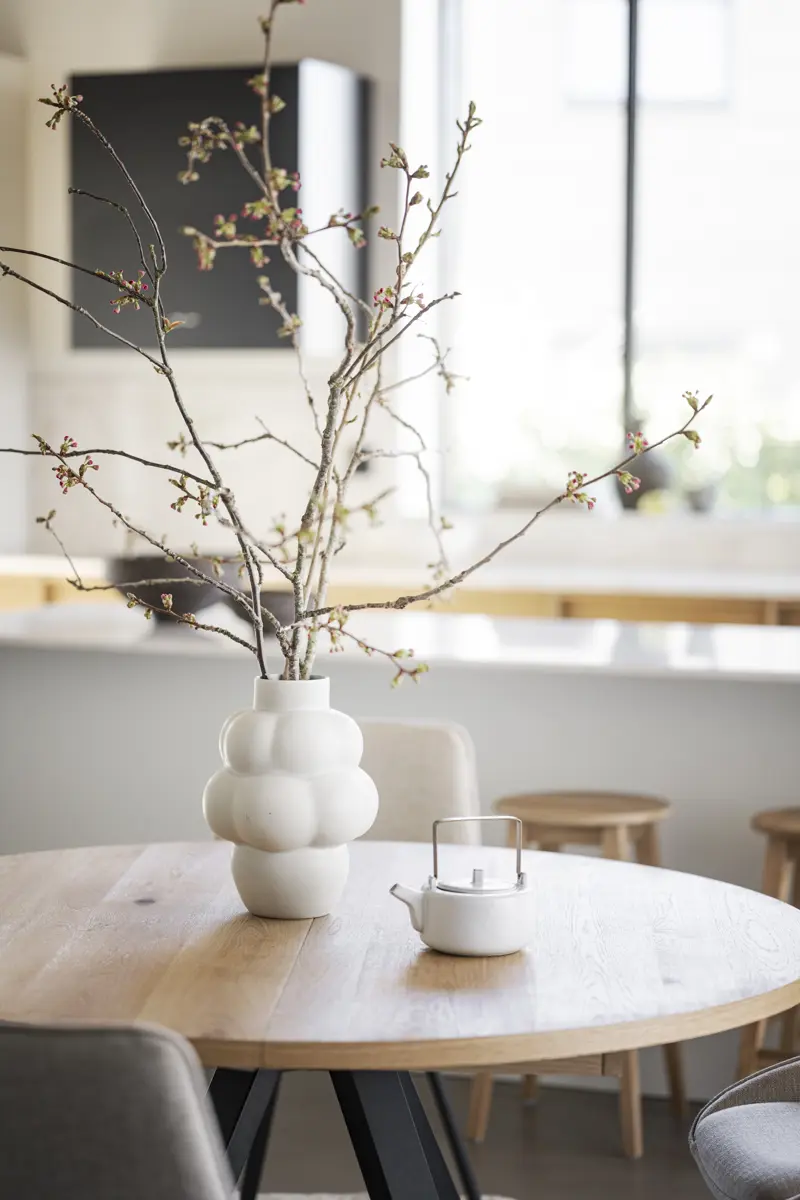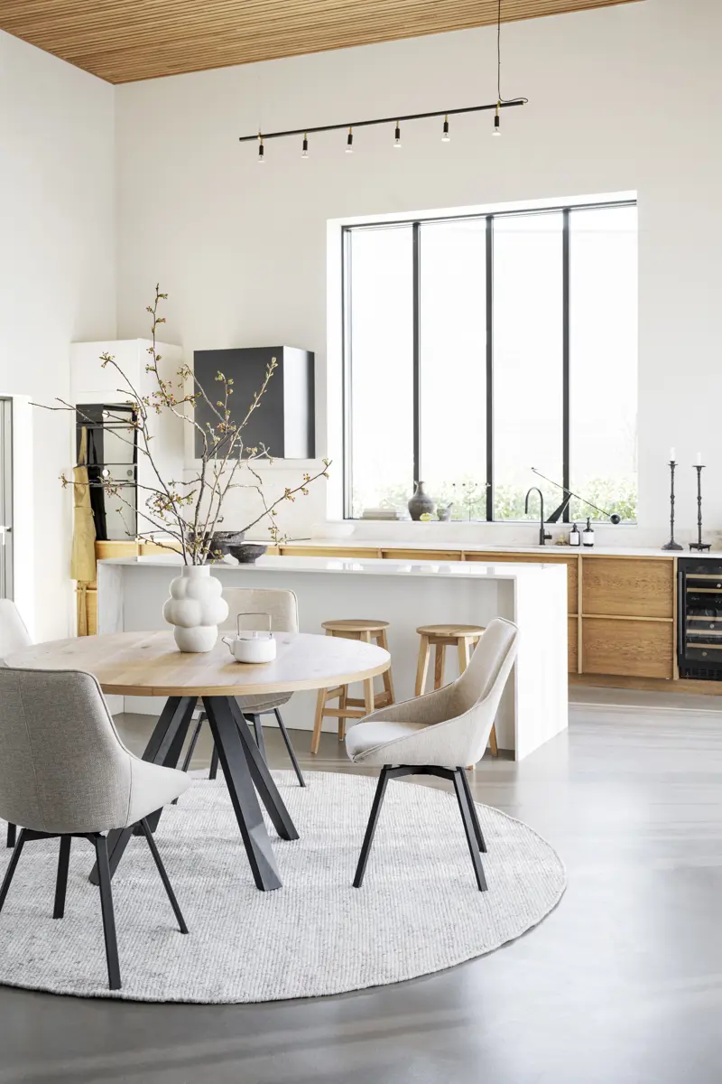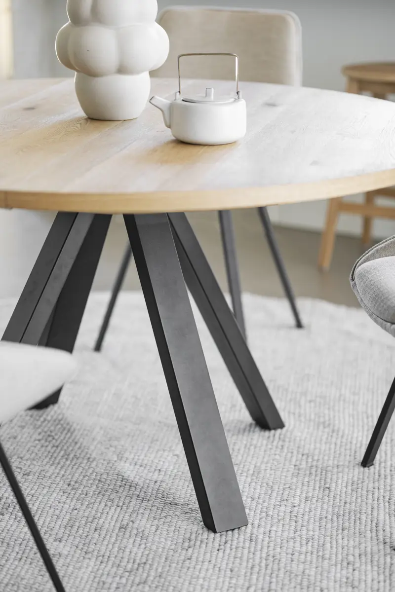 Maddock är ett praktiskt och förlängningsbart runt matbord med bordsskiva av FSC®-certifierad oljad ek och svarta pulverlackerade metallben. Matbordet blir blickfånget i rummet och förmedlar en stabil och stilsäker känsla. Skapa gemenskap och utrymme för fler genom att köpa till 1 eller 2 iläggsskivor och omvandla det till ett stort ovalt bord. Tack vare att trä med synliga kvistar har tagits tillvara i tillverkningen så har varje bord en unik träkänsla. Bordsskivan är semimassiv och det innebär att toppen består av 3 mm massiv ekfaner, vilket gör den mycket hållbar. Högkvalitativt och hållbart – detta är ett matbord att använda och älska i många år framöver.