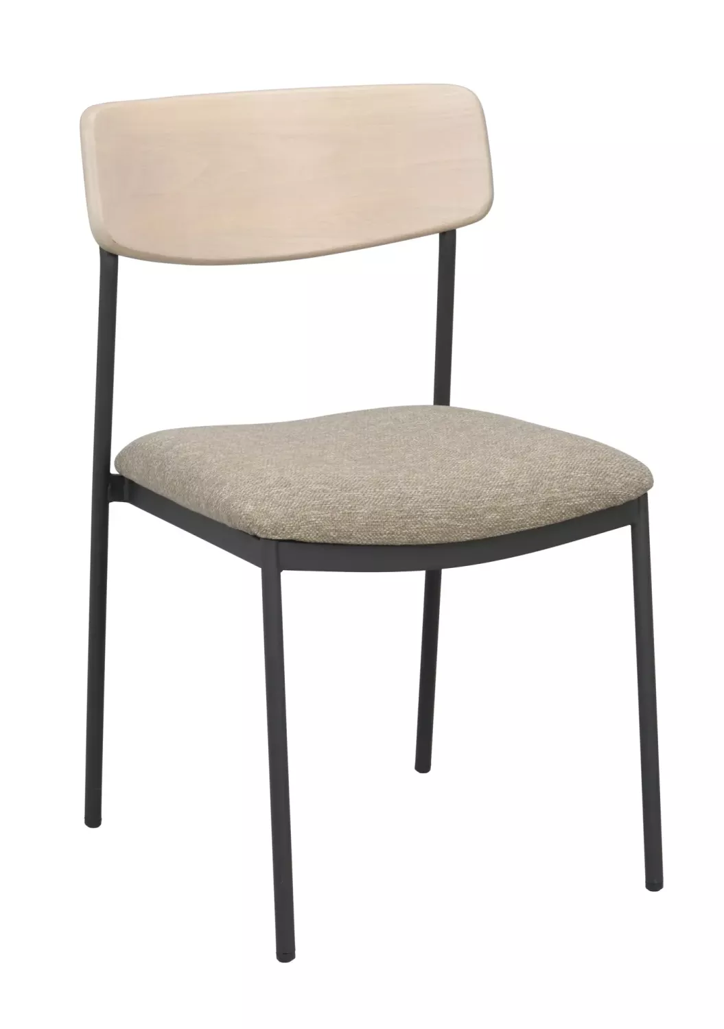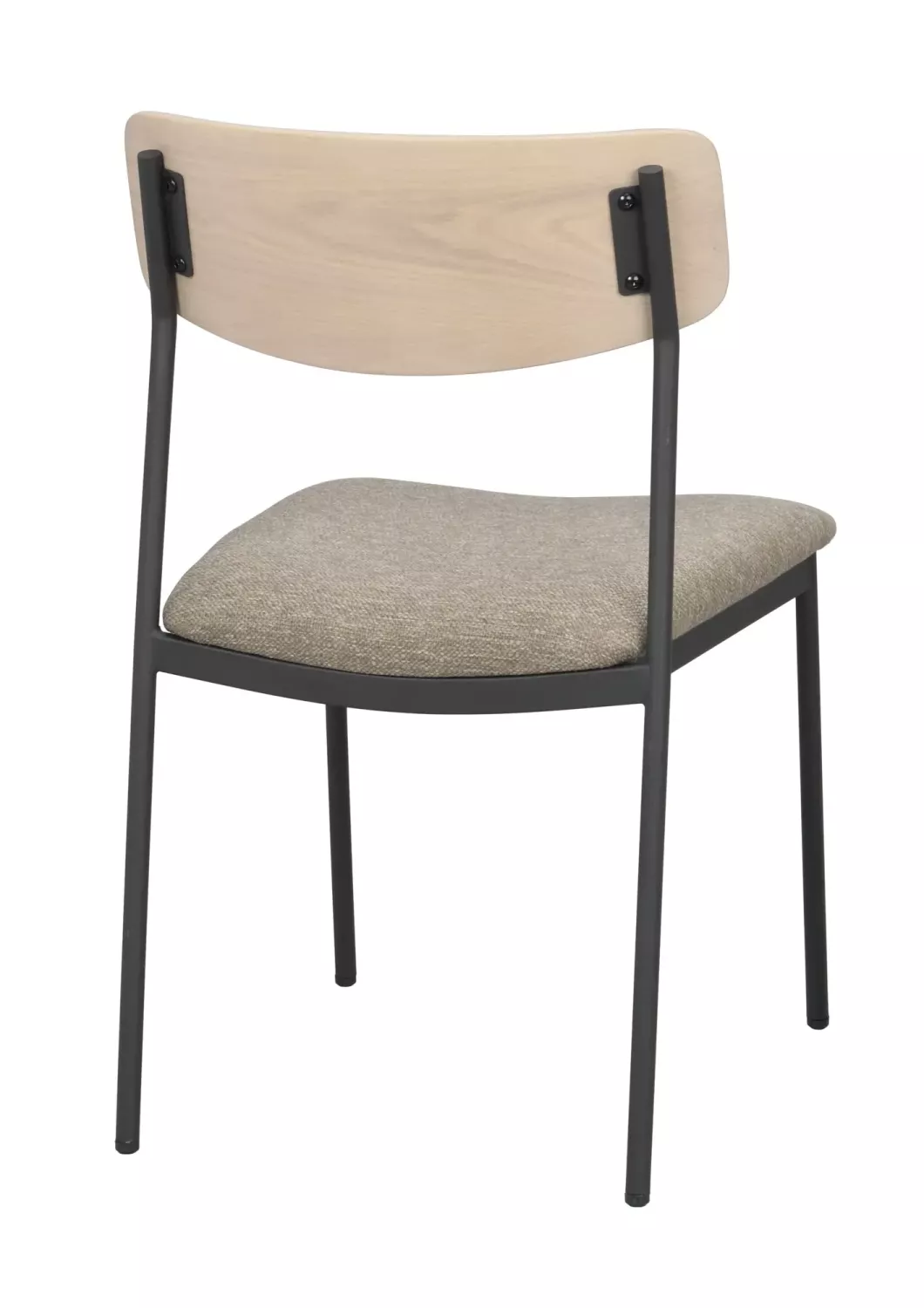 Material: Stålram med sandstukturerad pulverlack, massiv ek i ryggbricka, och plywoodsits klädd med polypropylen tyg
