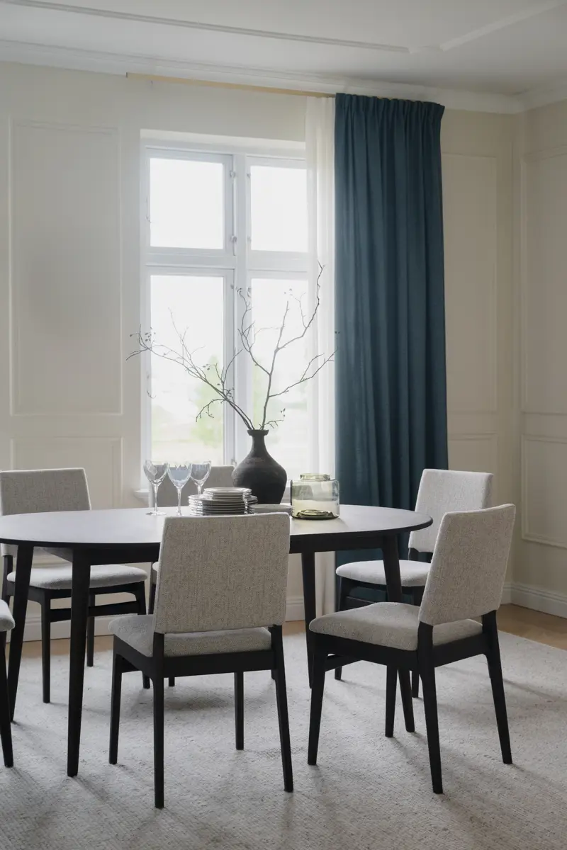 Material: Massiv ek, plywood i sits, tygklädd sits och rygg.