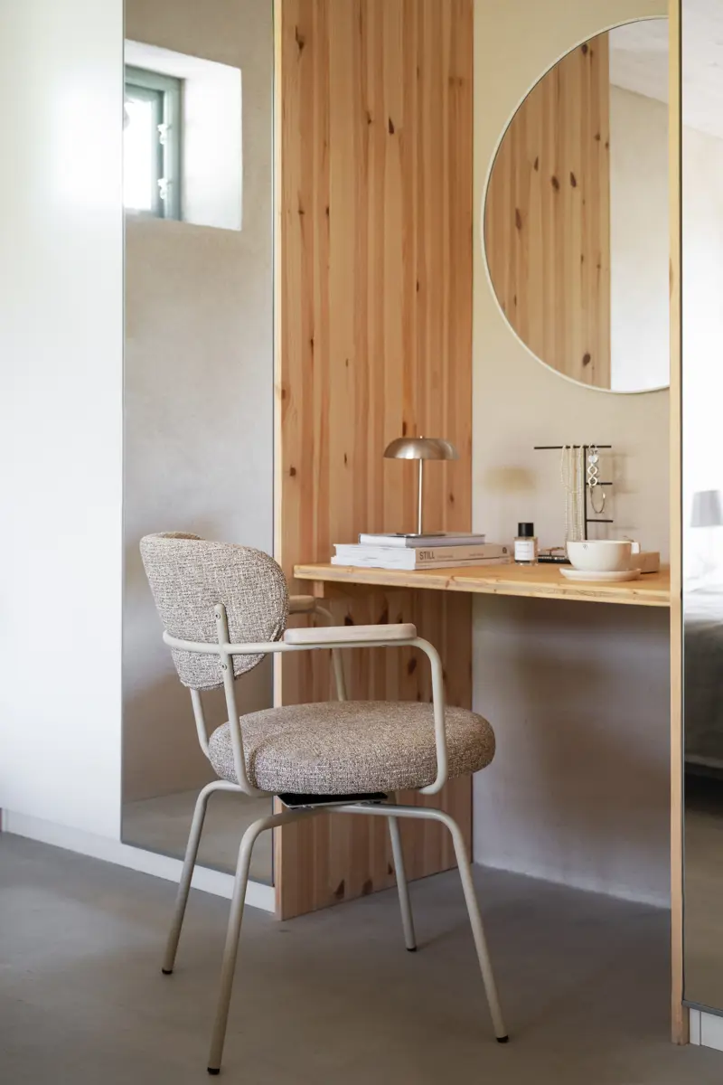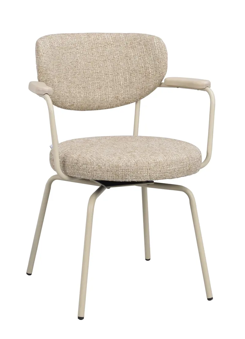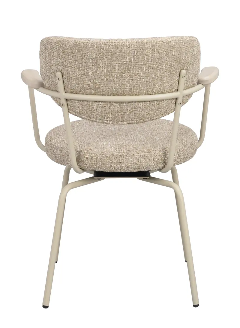 Merrick är en trendig stol med en tunn, elegant konstruktion som kombinerar industriell känsla med varma material. En beige metallram möter sits och rygg i slitstarkt tyg, en harmonisk mix av stram form och inbjudande komfort.
