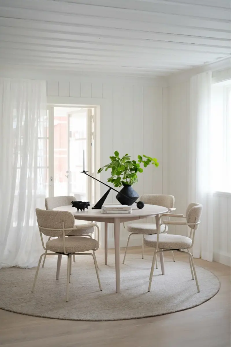 Stolen har en praktisk retur-funktion som gör att den automatiskt roterar tillbaka till sin ursprungliga position, perfekt för matsal, mötesrum eller sociala ytor där ordning och symmetri spelar roll. Merrick är dessutom stapelbar, upp till tre stolar, vilket gör den enkel att förvara och flexibel att använda vid behov.