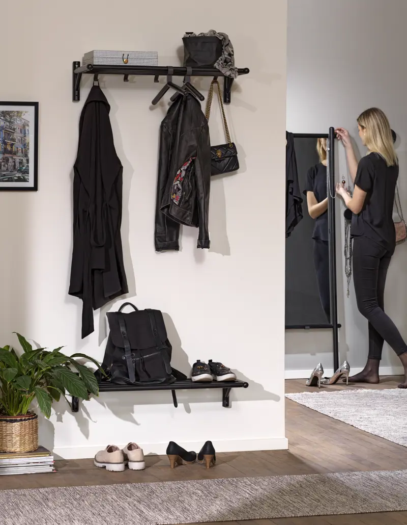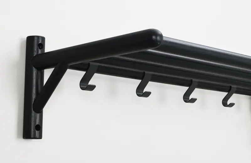 Milford hatthylla i svart ek med svarta metallkrokar. Är en trendsäker hatthylla och ingår i serien Milford.