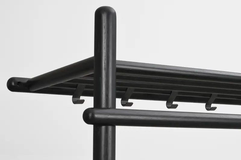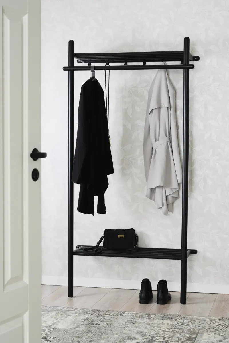 Milford klädställning i massiv svartlackad ek med svarta metalldetaljer. En klädställning som passar i hallen eller sovrummet.