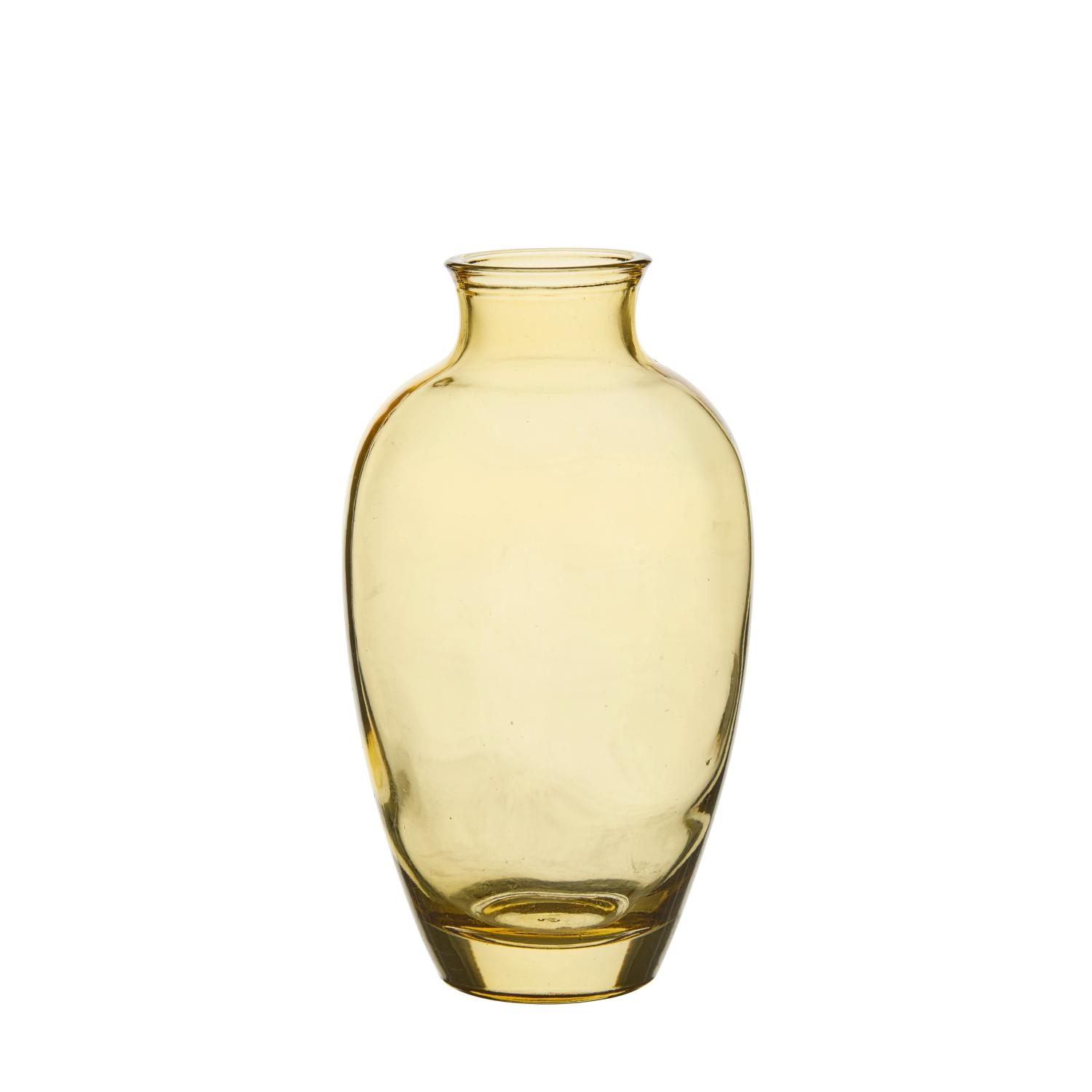 Denna vasen har en mjukt rundad, nästan äggformad kropp som smalnar av upptill mot en kort hals och en svagt utsvängd mynning. Denna form är idealisk för enstaka blommor eller små buketter. Vasen är tillverkad i glas med en mjuk, gul ton.
