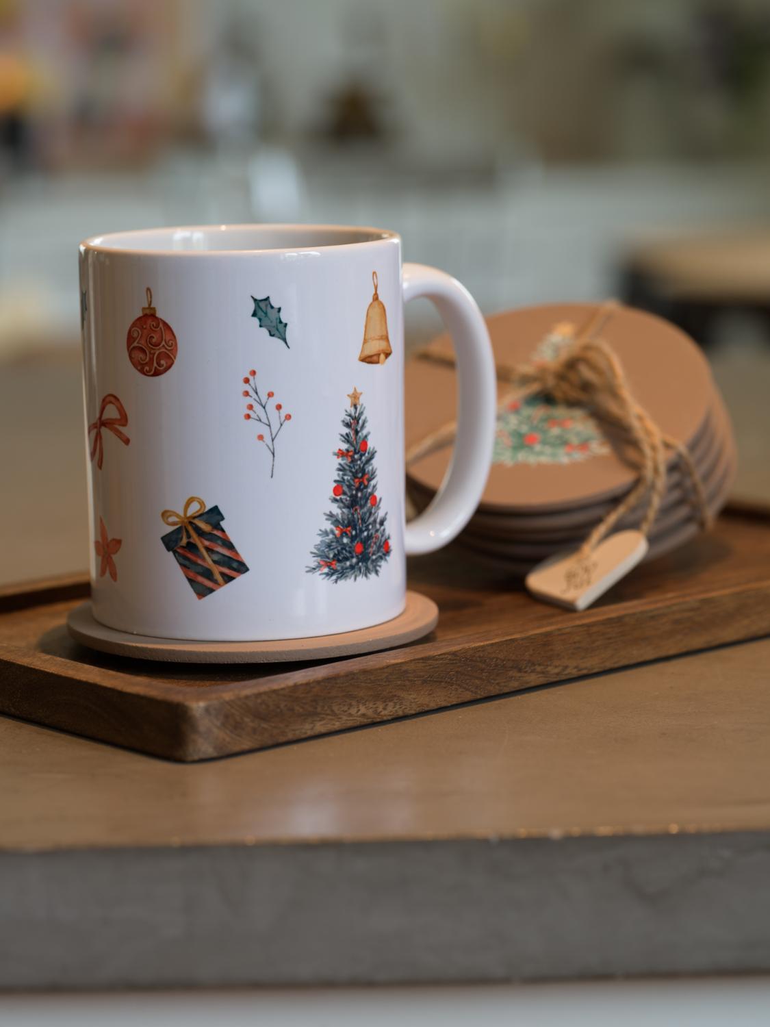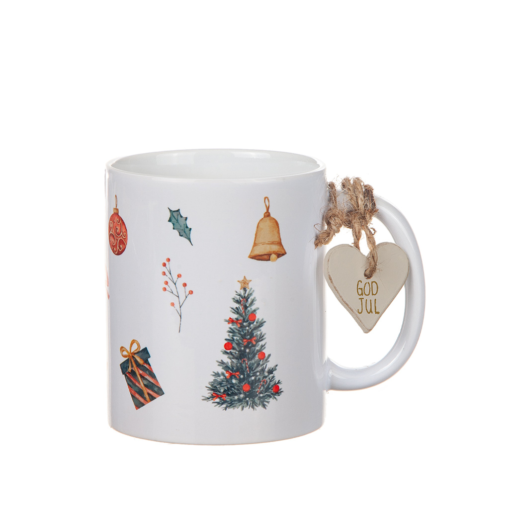 Vit julig mugg med olika juliga bilder så som nötknäppare, julgran, julkulor, paket m.m. En fin klapp till den som redan har allt. Eller varför inte till barnens pedagoger.