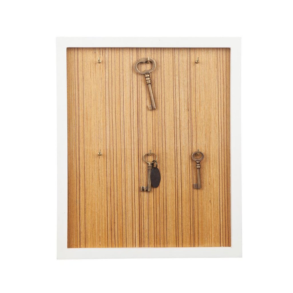Snygg tavla med vitmålad ram och ekfärgat trä med sex mässingsfärgade krokar där du kan hänga dina nycklar på ett stilrent sätt.