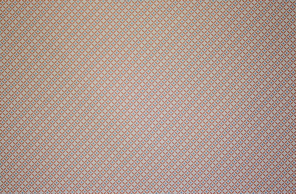 Stilrent möbeltyg i orange metallic-look med småmönstrade diamanter med turkosblått inne i dem som täcker hela tyget. Passar perfekt till att klä om kökssoffor, stolsdynor eller varför inte din favoritfåtölj.