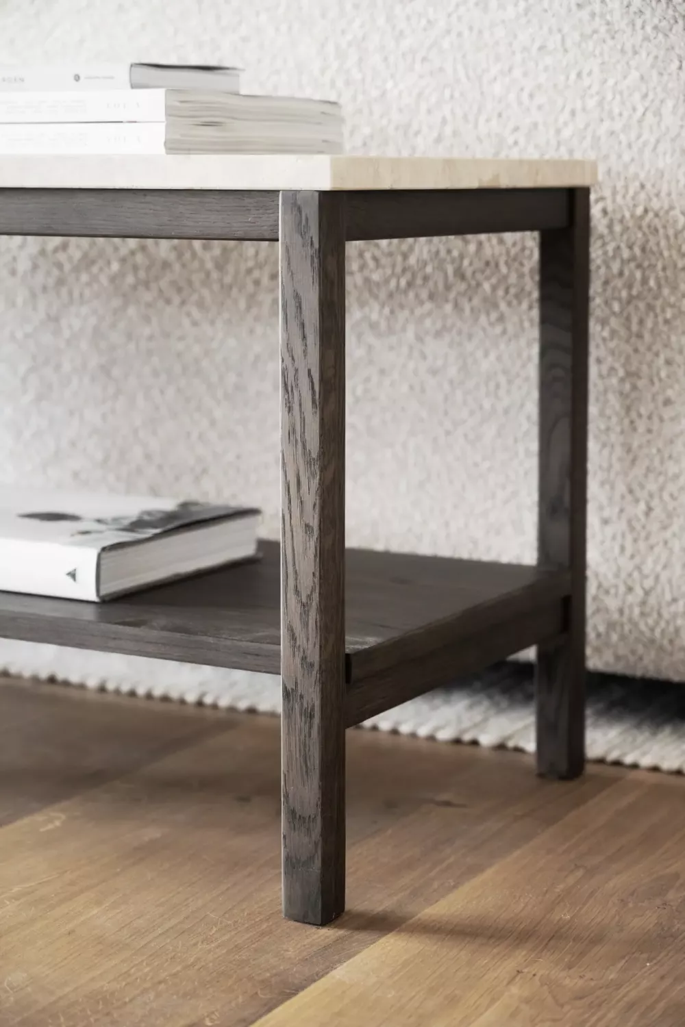 Avlastningsbordet Orwel har en exklusiv stenskiva av sandfärgad travertin från Italien som vilar på en stomme av brunlackad FSC-certifierad ek.
