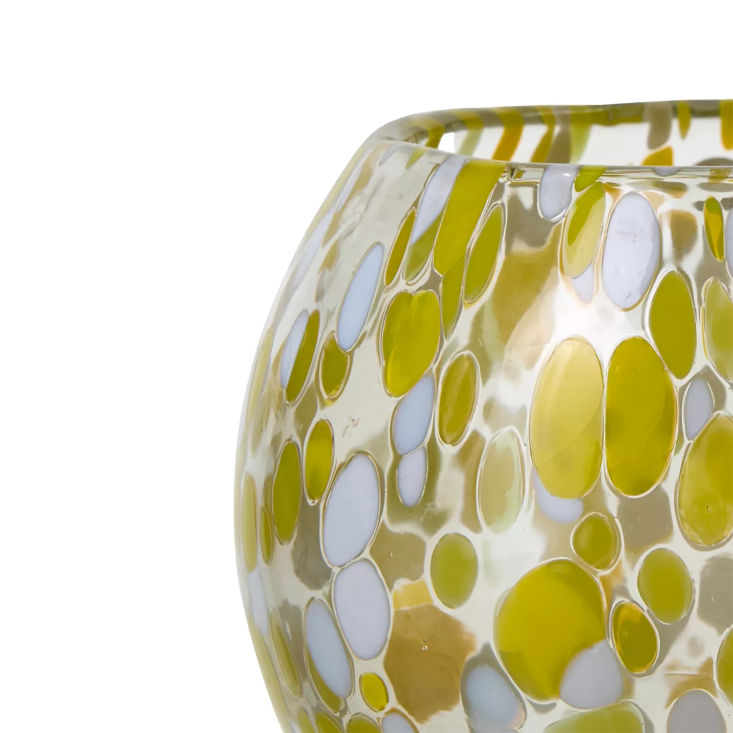 En vacker och lekfull ljuslykta tillverkad i munblåst värmeljusglas och det unika mönstret skapas genom färgat strössel av glas, vilket ger ett livfullt uttryck i inredningen.