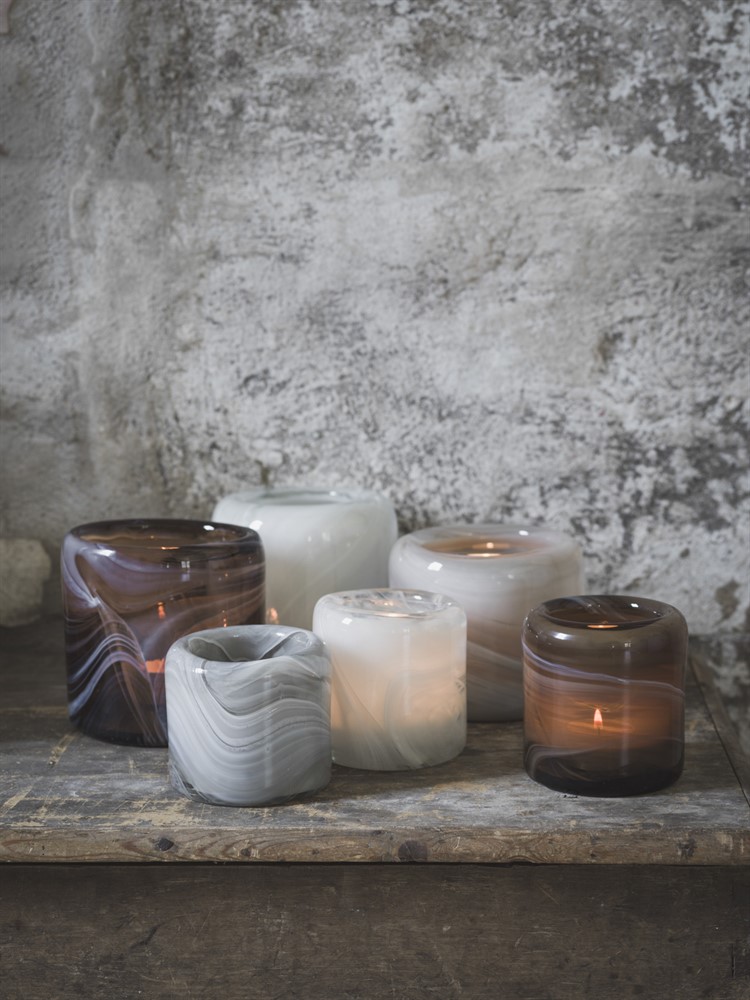 Vacker handgjord och munblåst rejäl ljuslykta med tjock rundad kant upptill. Puro kommer här i vackert melerande jordnära färger så som grönt och beige. En naturlig variation mellan lyktorna kan förekomma i storlek och färger eftersom de alla är handgjorda. Matcha gärna med den större storleken i samma färg.