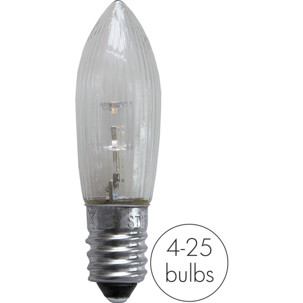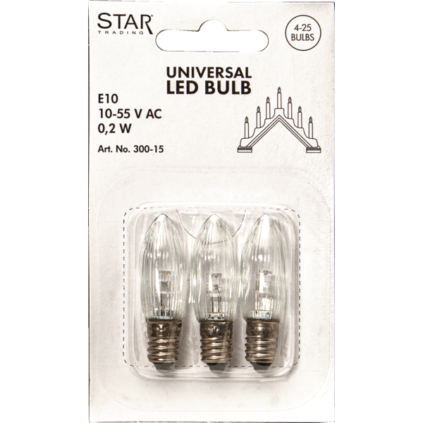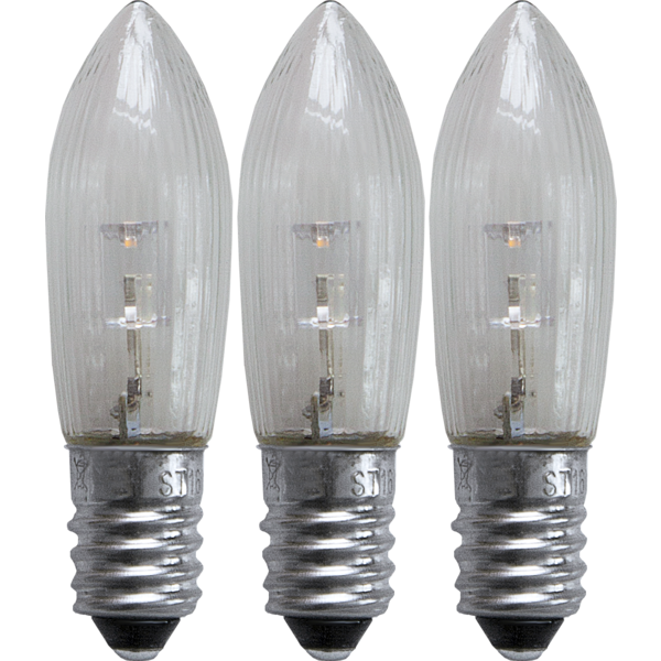 3-pack reservlampor med LED, klart glas, E10 sockel och 10-55V. Denna produkt passar till ljusstakar med 4-25 lampor och stickkontakt. För inomhusbruk.