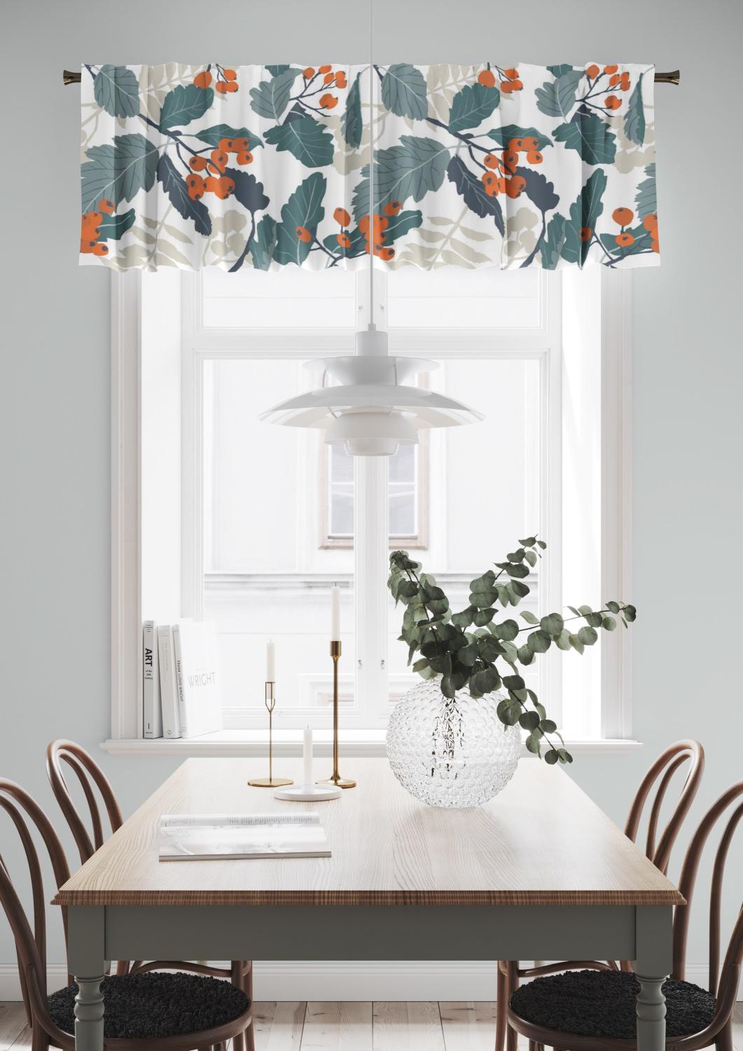 Snygg kappmetervara med vit bottenfärg och ett stilrent mönster av rönnkvistar med petrolblåa, turkosa och beigea blad med orangea rönnbär. Kappan passar lika bra i vardagsrummet som i köket och med den härliga bomullskvaliten så får kappan ett riktigt fint fall.
