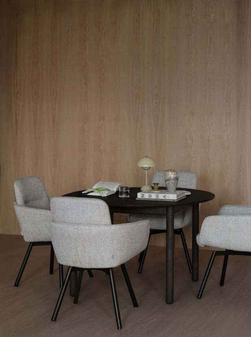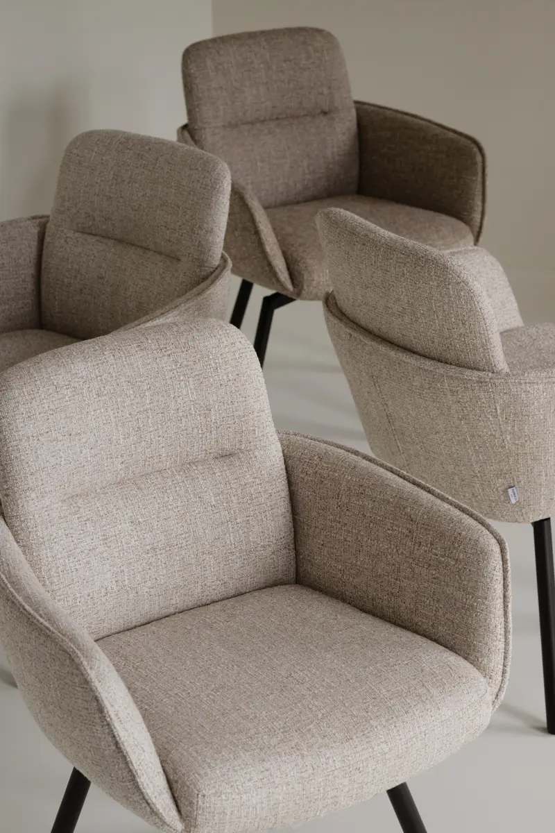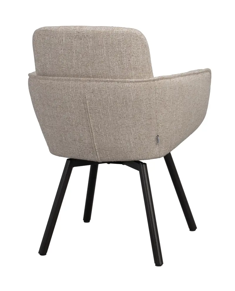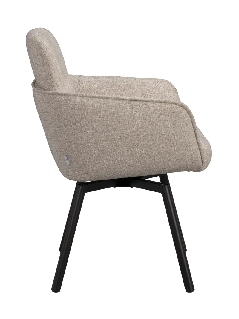 De elegant formade armstöden ger både visuellt lugn och extra komfort, medan det mörkbruna metallunderredet tillför en modern karaktär som gör att stolen smälter in i många olika miljöer. Snurrfunktionen gör det enkelt att röra sig naturligt vid bordet, vilket ger extra flexibilitet och en mer dynamisk möblering.