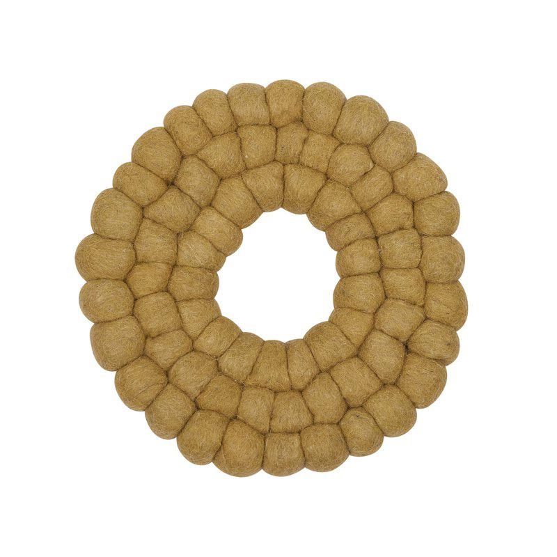 Ett grytunderlägg i ull med små bollar på, är en vacker och praktisk accessoar till ditt kök. Grytunderlägget har en tjock och tät struktur tack vare ullens naturliga egenskaper, vilket gör det perfekt för att skydda dina ytor från värme och repor. Kommer här i en fin påskgul färg.