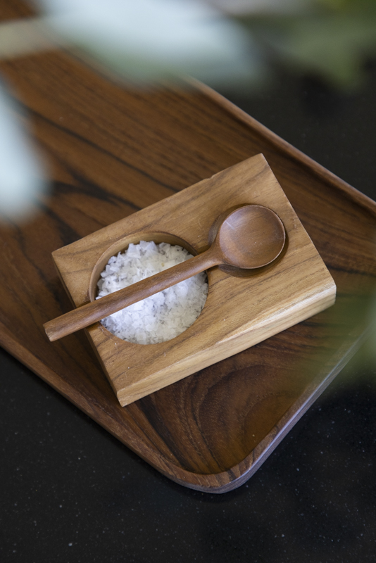 Snyggt litet träfat i teak med en urgröpt skål i med tillhörande sked. Perfekt att ha stående på bordet för att ha antingen salt eller peppar i. Enkel att ta ur med hjälp av skeden och blir en riktigt fin inredningsdetalj till ditt bord.
