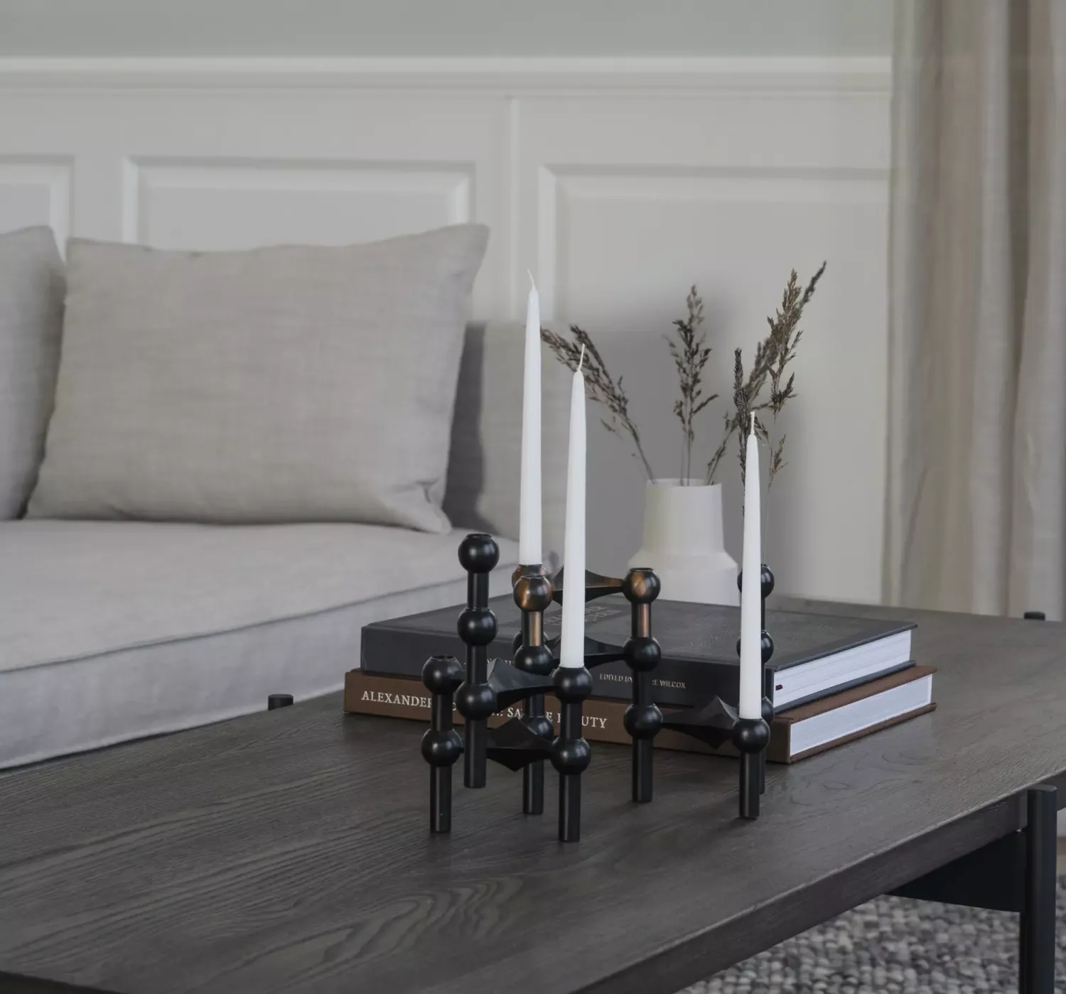 Shelton soffbord är ett stilfullt soffbord med bordsskiva i massiv brun oljad ask och med svarta metallben i rund profil.